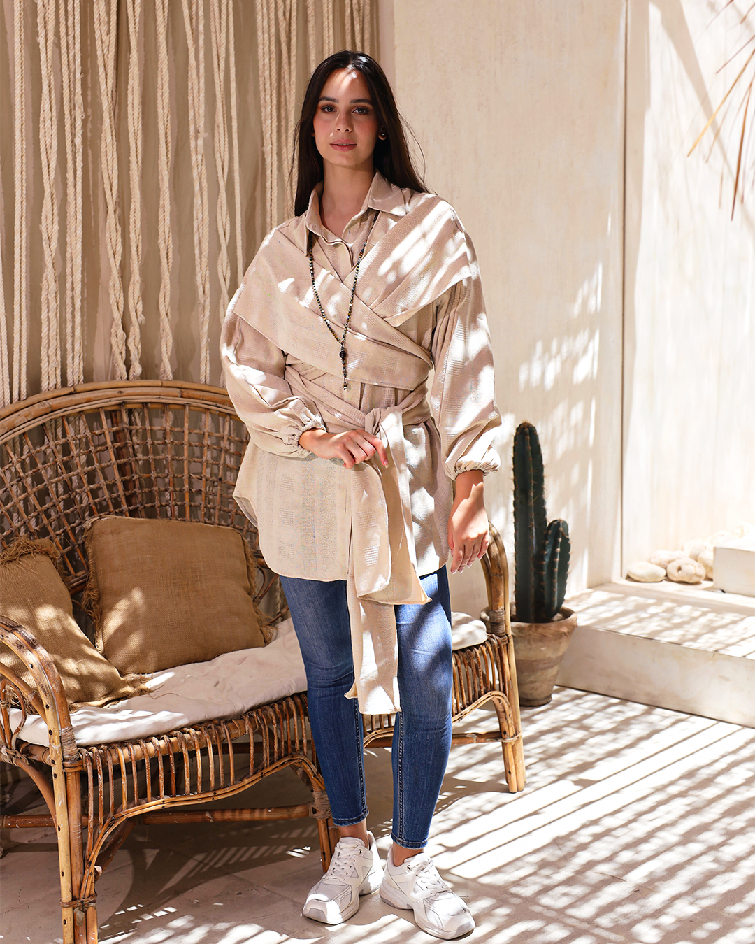A modern twist on the classic button-down — the tied shirt features a front knot or wrap detail that adds shape and style. Effortlessly versatile, it can be dressed up with tailored pants or worn casually with jeans and skirts. Crafted from lightweight, breathable fabric, this piece combines comfort with a chic, contemporary edge.